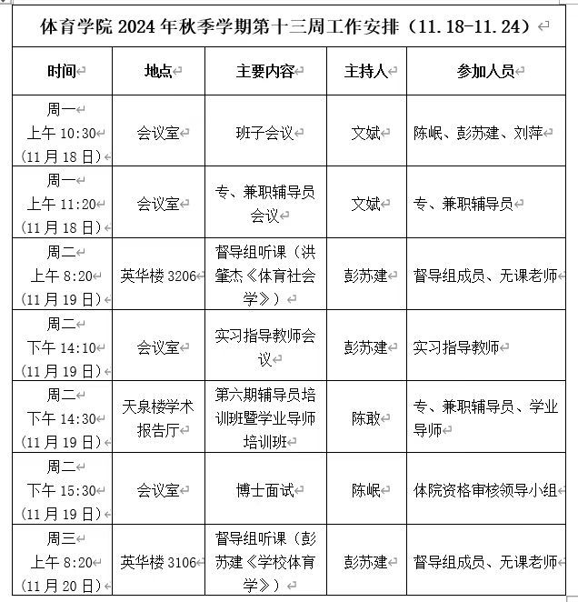 体育学院2024年秋季学期第十三周工作安排(11.18-11.24)