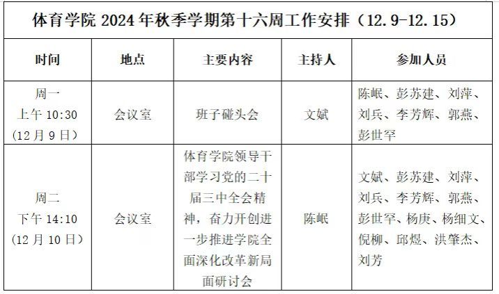 体育学院2024年秋季学期第十六周工作安排(12.9—12.15)