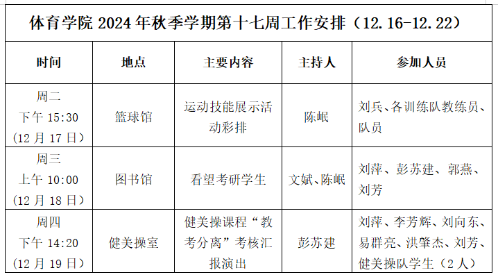 体育学院2024年秋季学期第十七周工作安排(12.16—12.22)