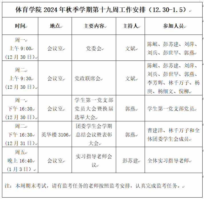 体育学院2024年秋季学期第十九周工作安排(12.30—1.5)