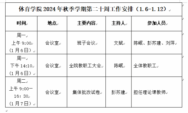 体育学院2024年秋季学期第二十周工作安排(1.6—1.12)