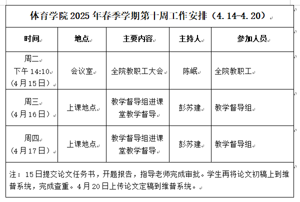 体育学院2025年春季学期第十周工作安排(4.14-4.20)