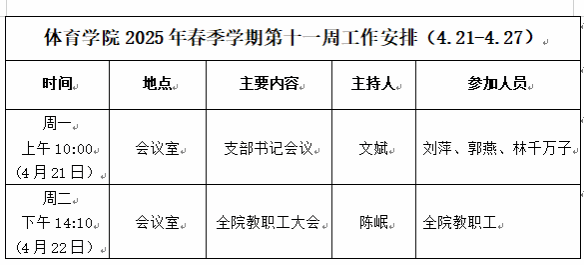 体育学院2025年春季学期第十一周工作安排(4.21-4.27)