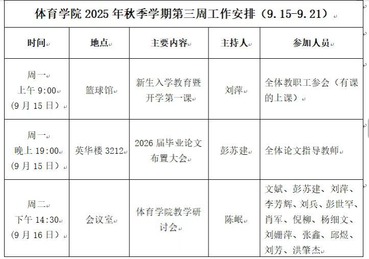体育学院2025年秋季学期第三周工作安排(9.15—9.21)