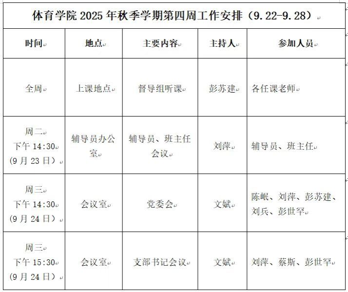 体育学院2025年秋季学期第四周工作安排(9.22—9.28)