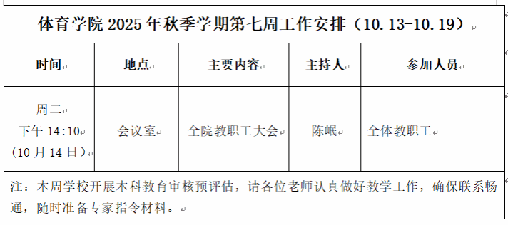体育学院2025年秋季学期第七周工作安排(10.13—10.19)
