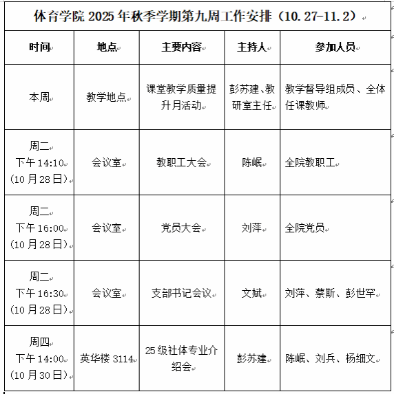 体育学院2025年秋季学期第九周工作安排(10.27—11.2)