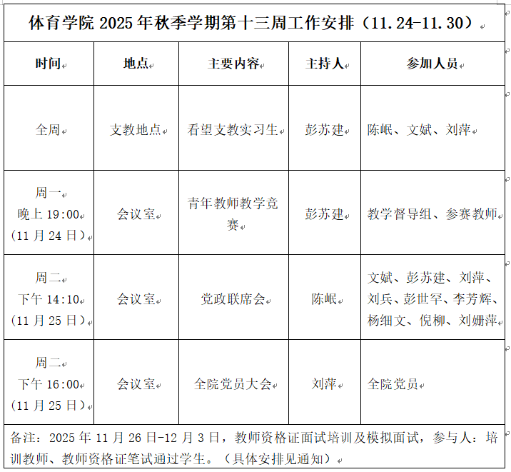体育学院2025年秋季学期第十三周工作安排(11.24—11.30)