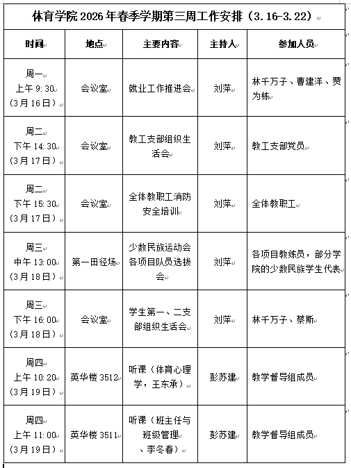体育学院2026年春季学期第三周工作安排(3.16—3.22)