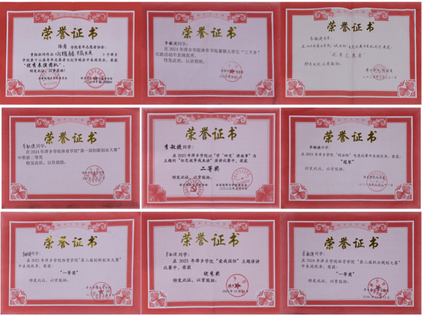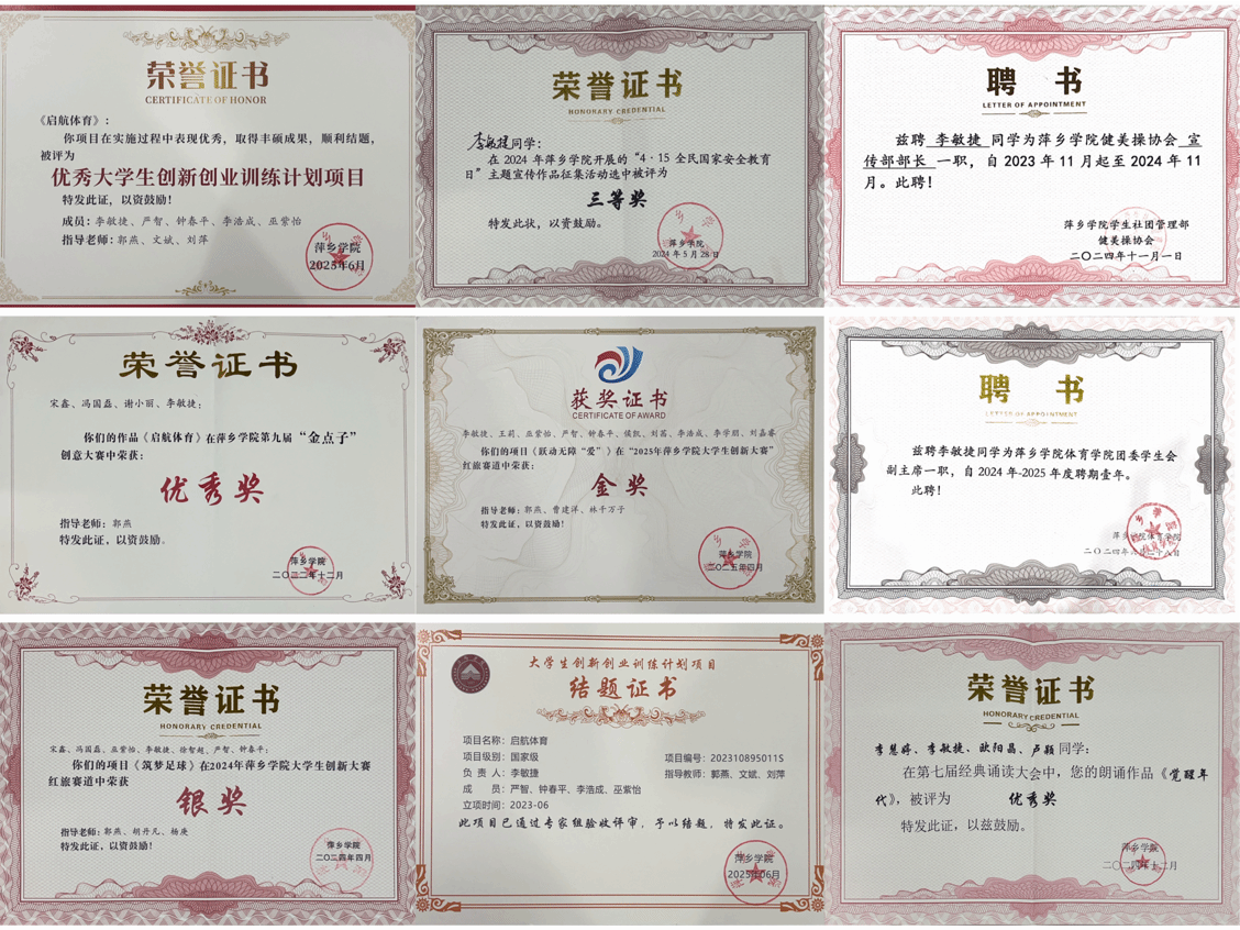 “励学”是她的成长密码。学业与综合考评名列前茅,斩获国家奖学金,校长奖学金,国家励志奖学金,主持国家级大创项目,拿下10项国家级奖项,6项省级奖项,27项校级奖项,22项院级奖项,考取啦啦操一级裁判员,二级教练员,社会体育二级指导员等,以拼搏锻造硬核实力。