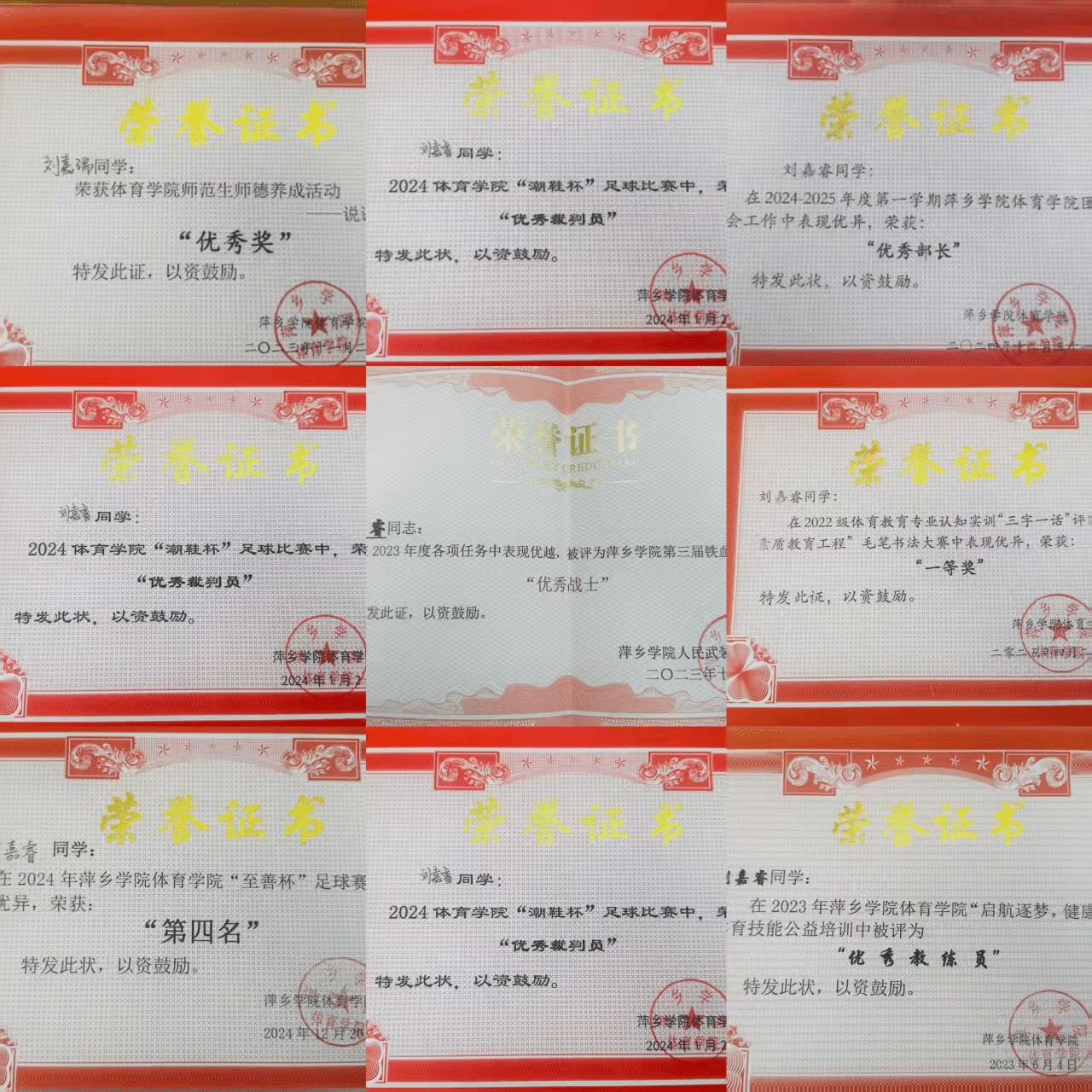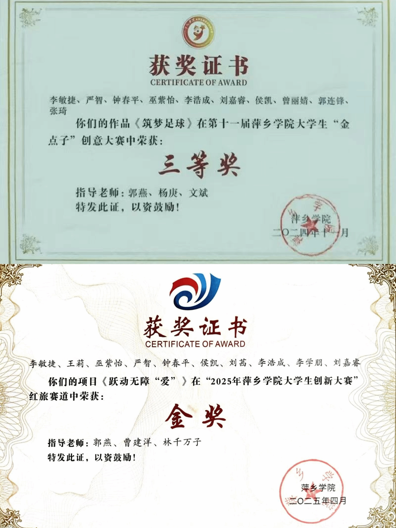 各类赛场中,刘嘉睿全面绽放才华。体育竞技上,他带领班级拿下2024年体育学院“元旦杯”篮球赛男子组冠军、女子组亚军,助力班级获第十一届田径运动会甲组团体总分第三名,还与队友并肩夺得“至善杯”足球赛殿军;专业领域里,他斩获萍乡市“天工杯”体育教师技能大赛三等奖、师德养成说课比赛优秀奖,带领团队凭《跃动无障“爱”》《筑梦足球》项目,分获2025年创新创业大赛金奖、第十一届“金点子”创意大赛三等奖;在文化才艺方面,他亦不负众望,拿下毛笔书法大赛一等奖、粉笔书法大赛二等奖,尽显“文武兼修”的素养。