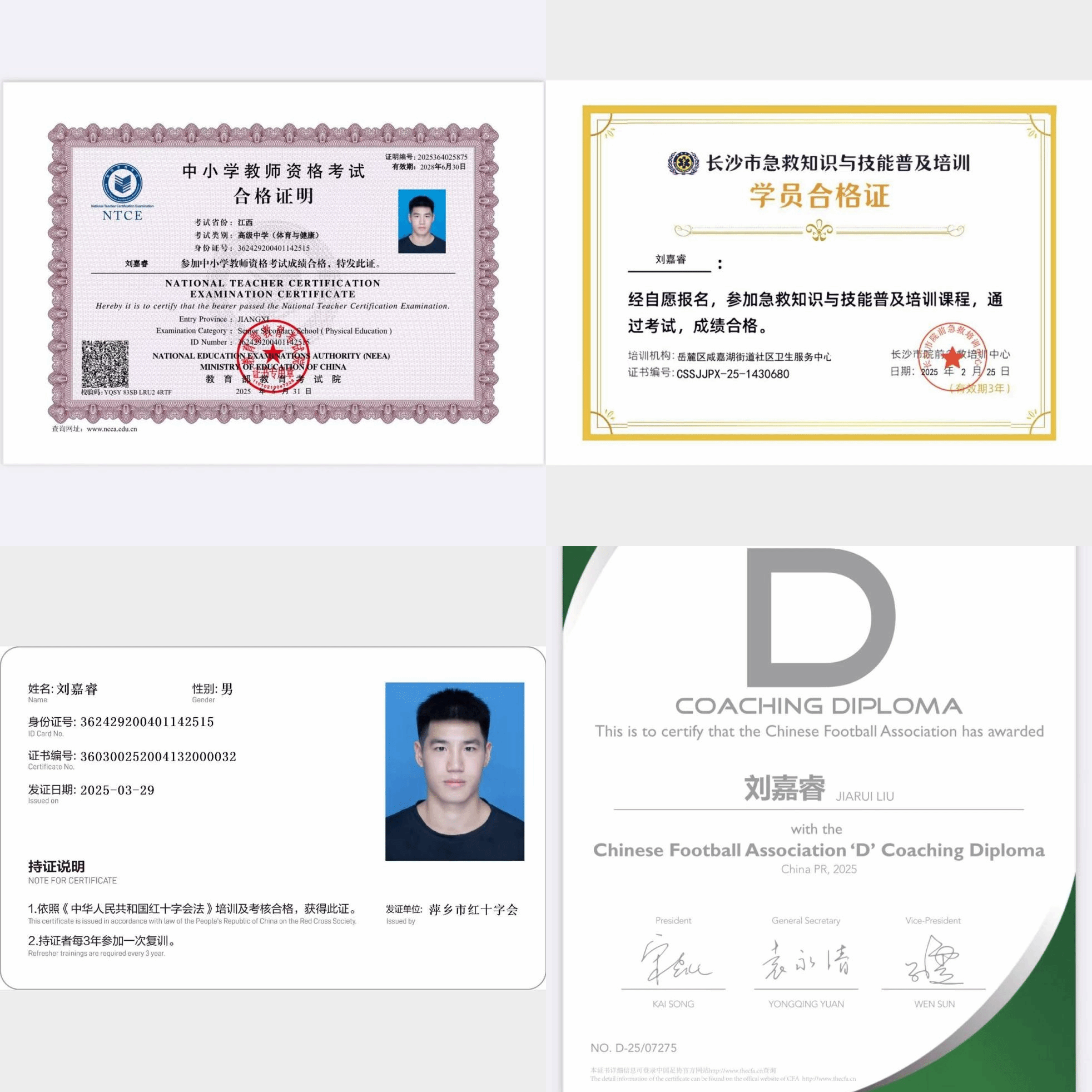 赛场之外,刘嘉睿在学业上同样保持着精益求精的态度,始终平衡好专业学习与各类实践活动,用扎实的成绩证明“全能”背后的踏实付出,先后荣获国家励志奖学金、国家奖学金。为了给未来职业发展筑牢根基,他主动考取多项核心资质证书:高级中学体育教师资格证夯实职业基础,中国足球D级教练员证书精进专业技能,萍乡市红十字会认证的AED+CPR急救证书则让他多了一份应急救援的底气与能力。